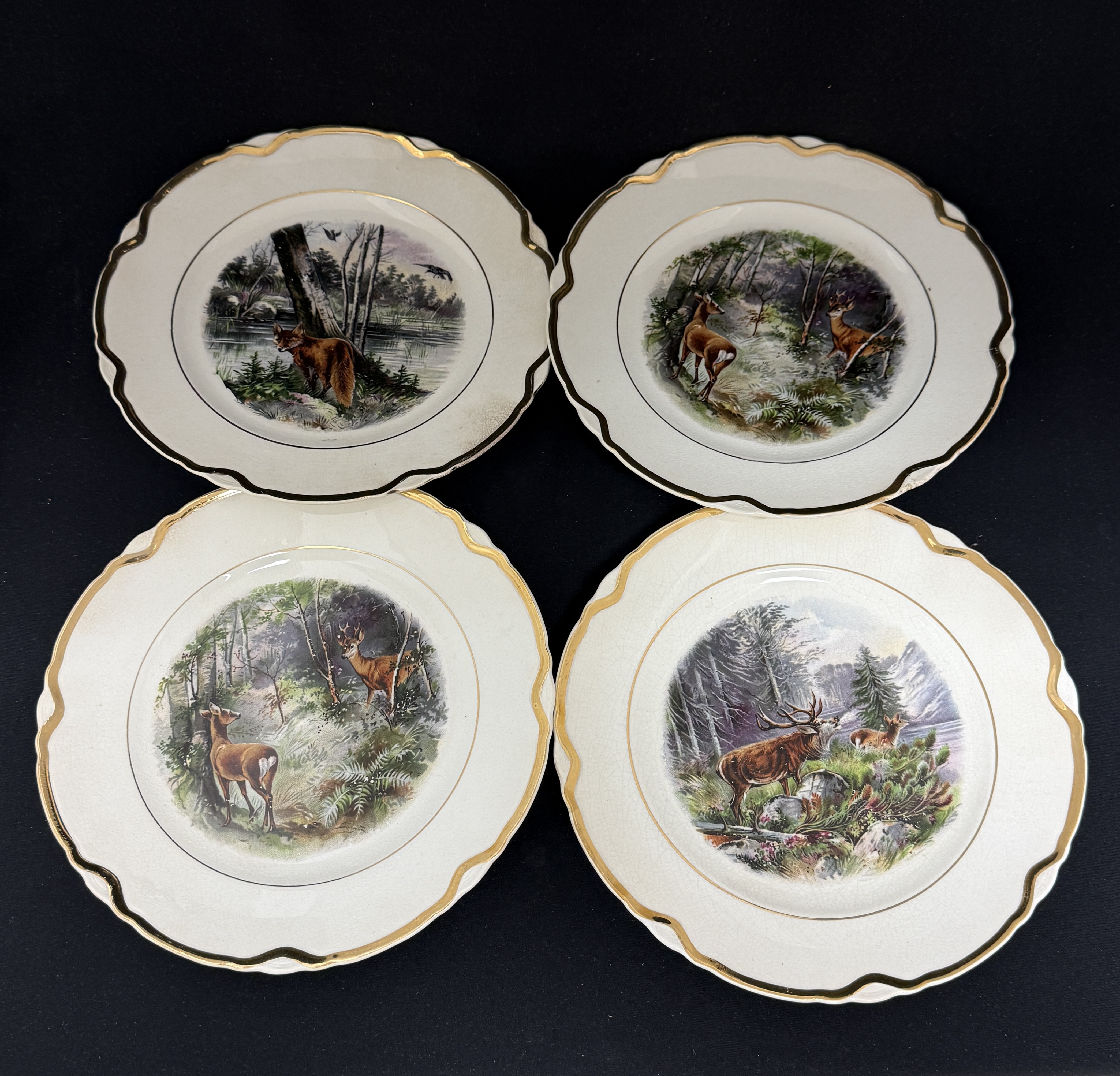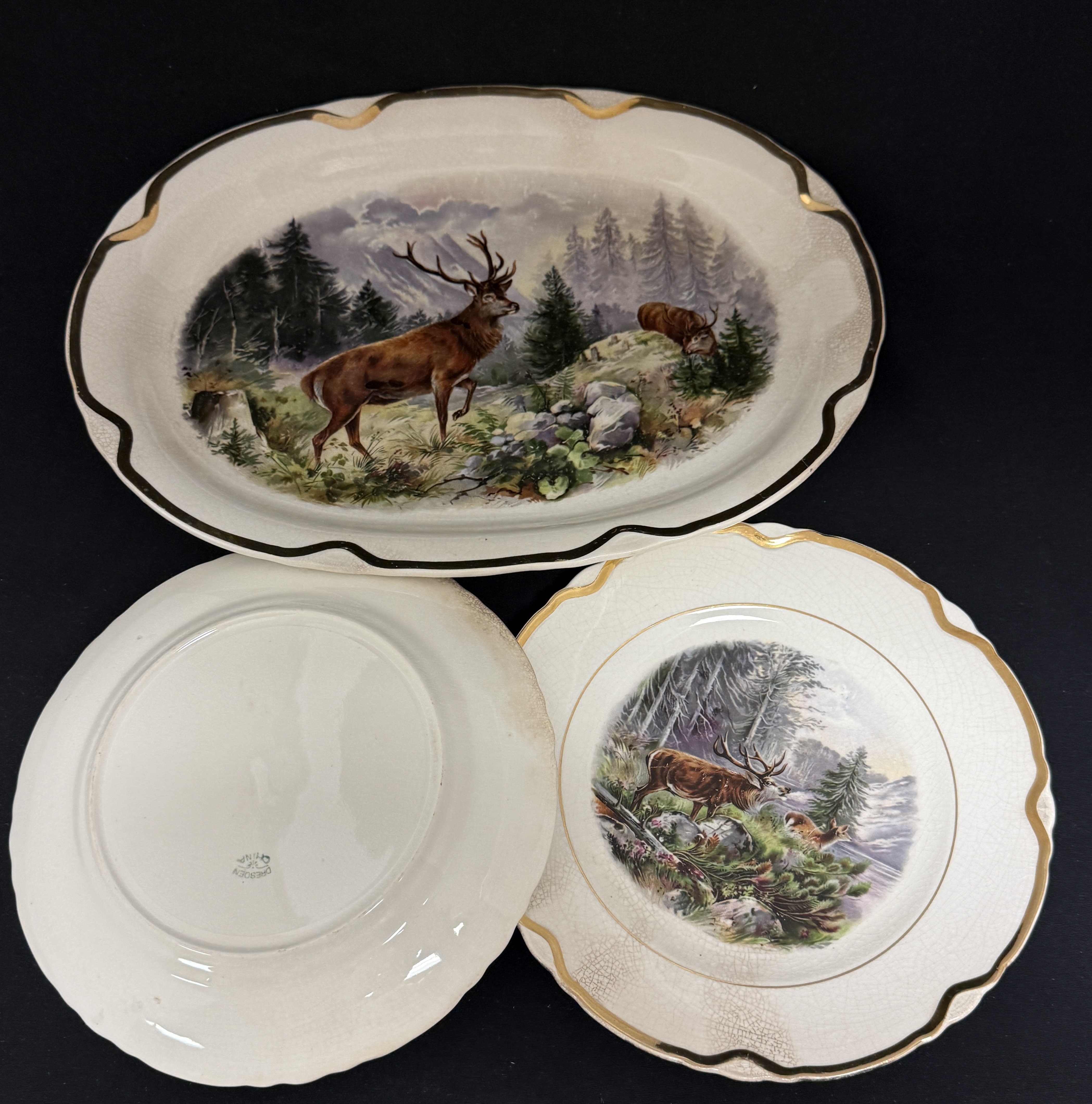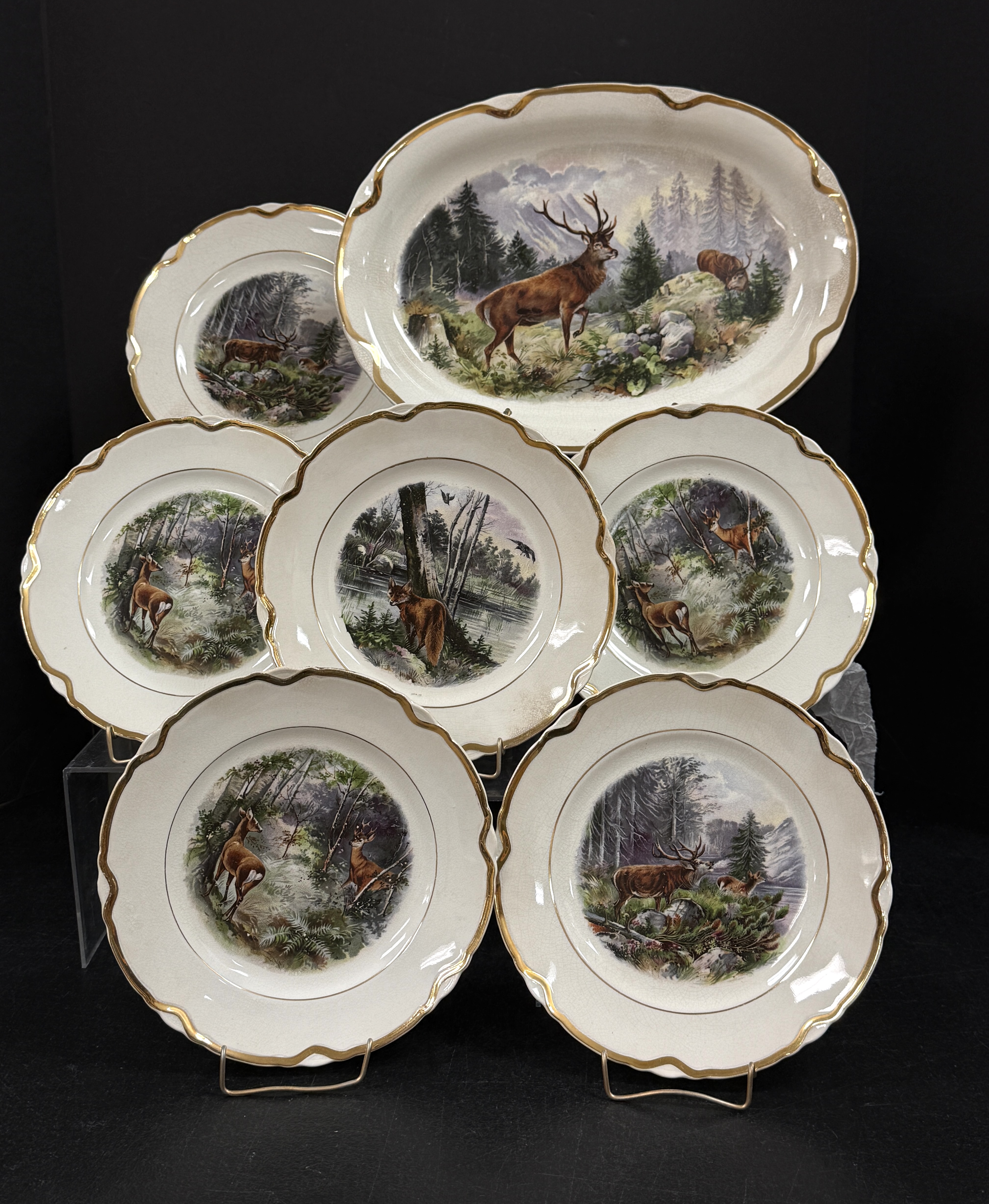 7 Dresden China items with deer motif, including a platter and 6 plates; platter length 13 1/2″. CONDITION: slight crazing no chips, cracks, repairs, or material defects found, Jaremos attempts to call any material flaw that affects the price, but minor scratches and color variances are inherent to glass and antiques.