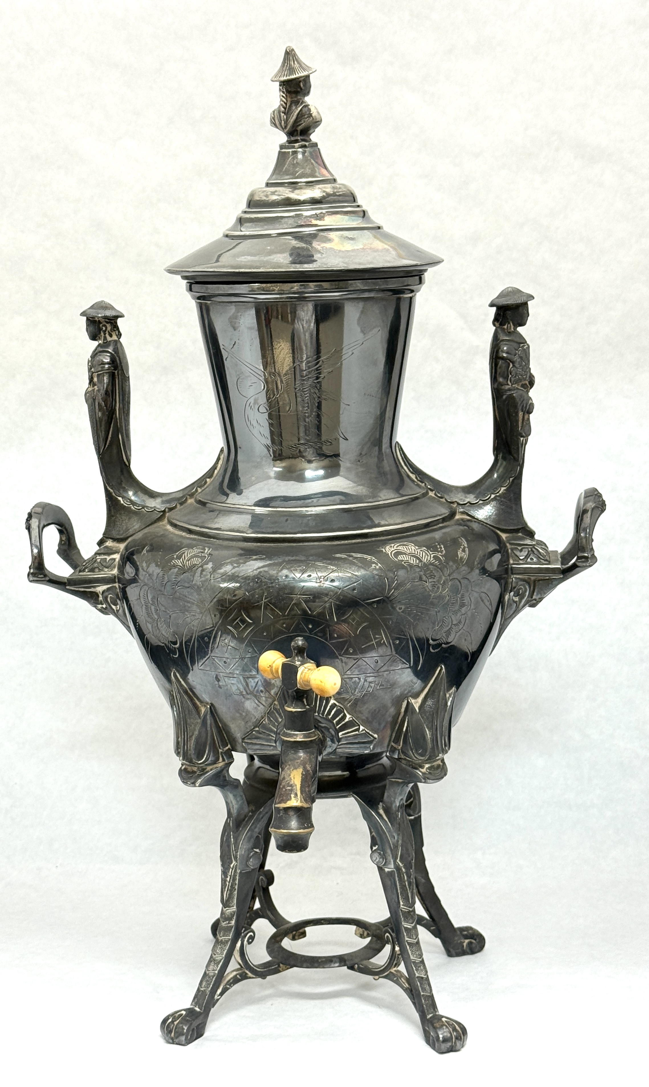 Large coffee urn, 18″ ht. CONDITION: no chips, cracks, repairs, or material defects found, Jaremos attempts to call any material flaw that affects the price, but minor scratches and color variances are inherent to glass and antiques.
