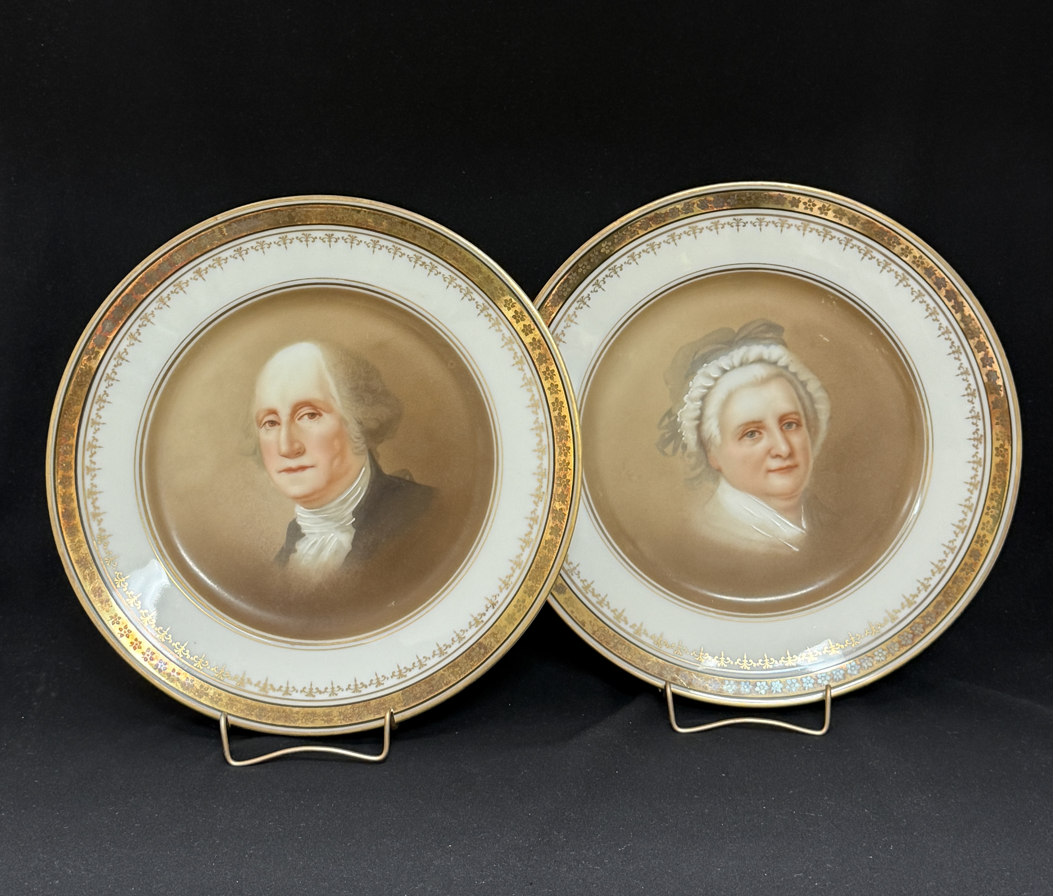 2 porcelain plates portrait plates, one of George Washington, the other of Martha; marked Thames, stamped Tatler 550; diameter 9 3/4″. CONDITION: no chips, cracks, repairs, or material defects found, Jaremos attempts to call any material flaw that affects the price, but minor scratches and color variances are inherent to glass and antiques.
