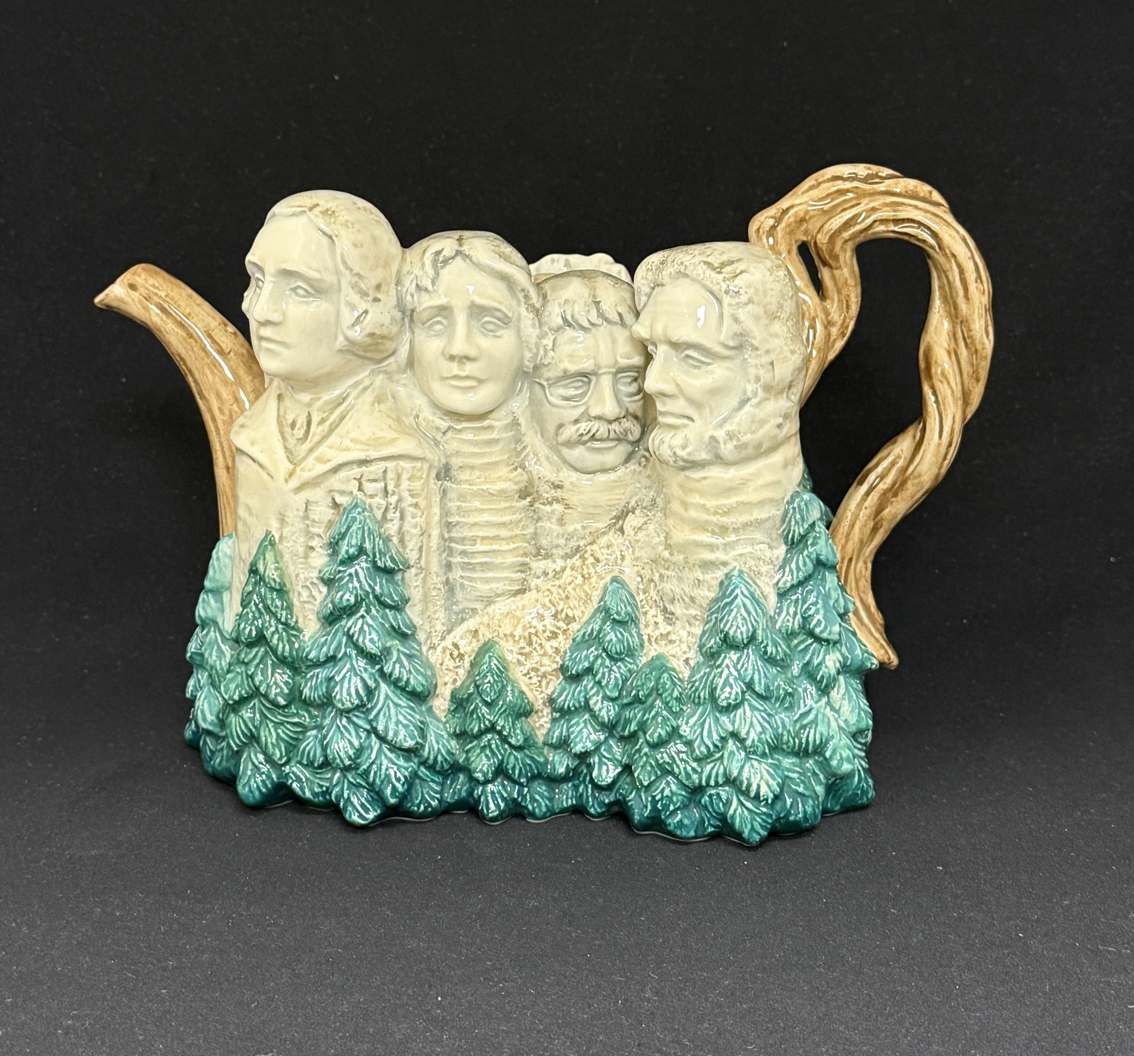 Fitz & Floyd Limited Edition Collectors Series Mt. Rushmore tea pot, 326 of 5000, ht. 6 1/2″. CONDITION: no chips, cracks, repairs, or material defects found, Jaremos attempts to call any material flaw that affects the price, but minor scratches and color variances are inherent to glass and antiques.