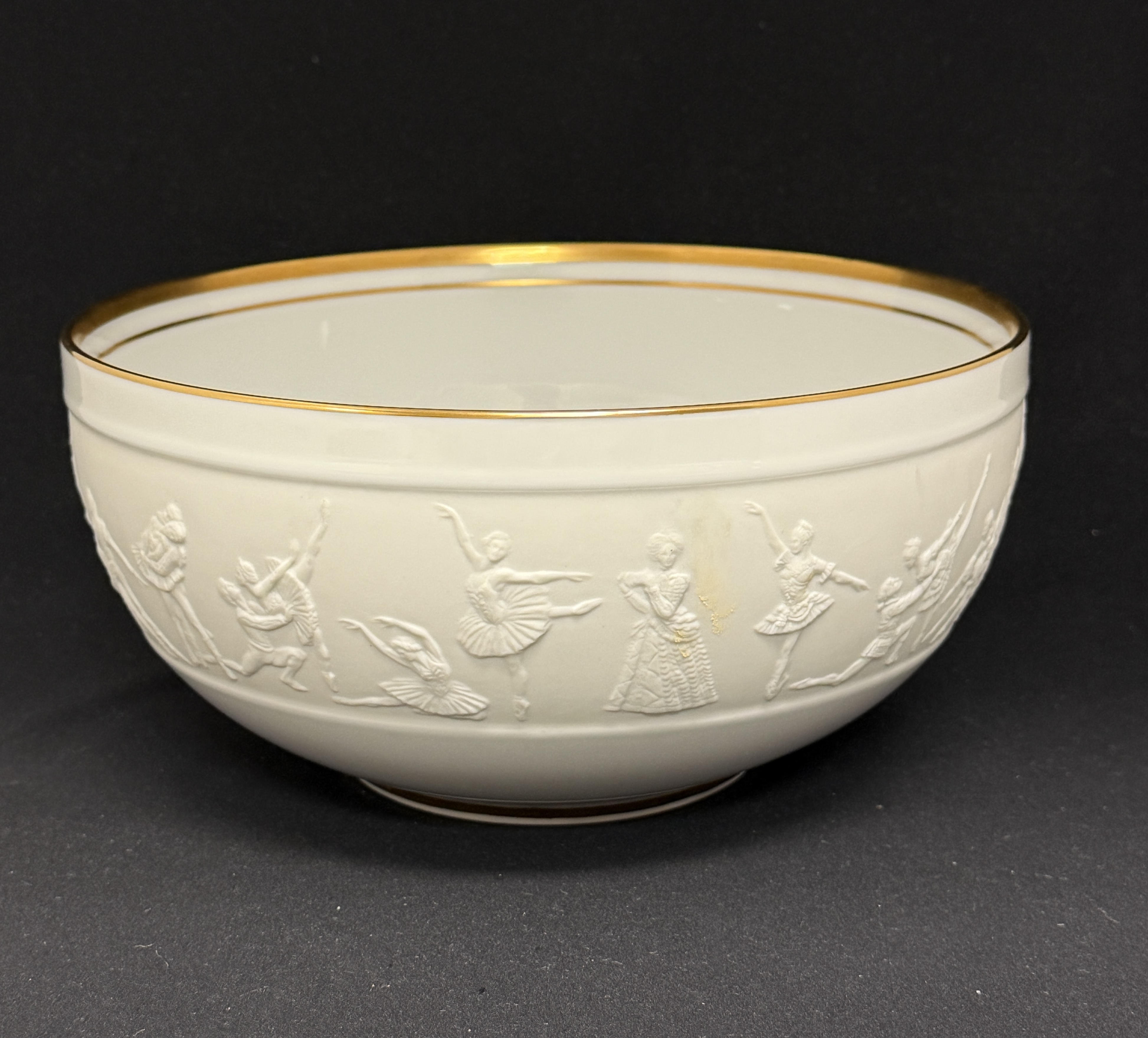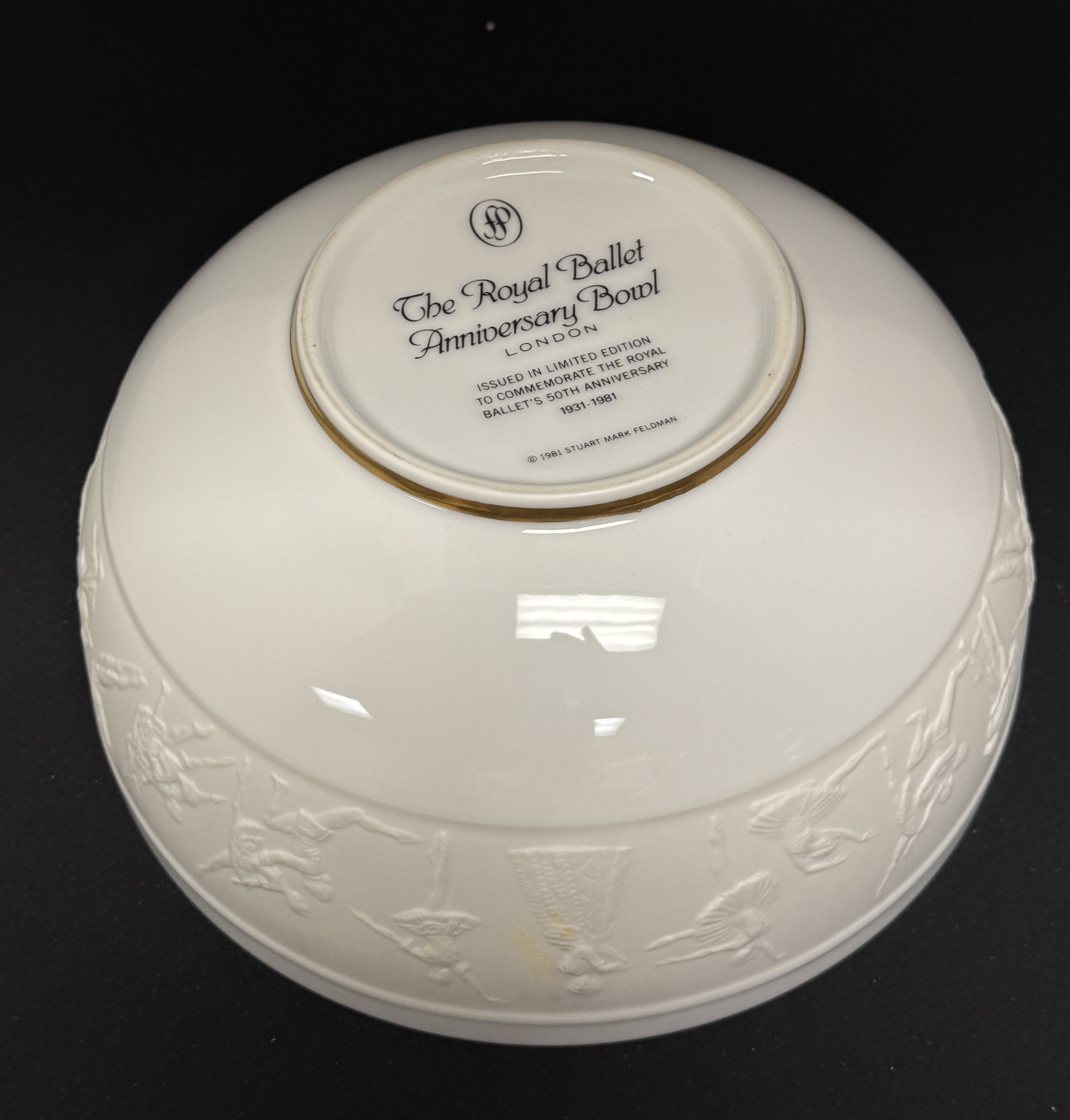 The Royal Ballet London 50th Anniversary porcelain bowl, limited edition to commemorate the 50th anniversary 1931 – 1981; diameter 9″. CONDITION: no chips, cracks, repairs, or material defects found, Jaremos attempts to call any material flaw that affects the price, but minor scratches and color variances are inherent to glass and antiques.