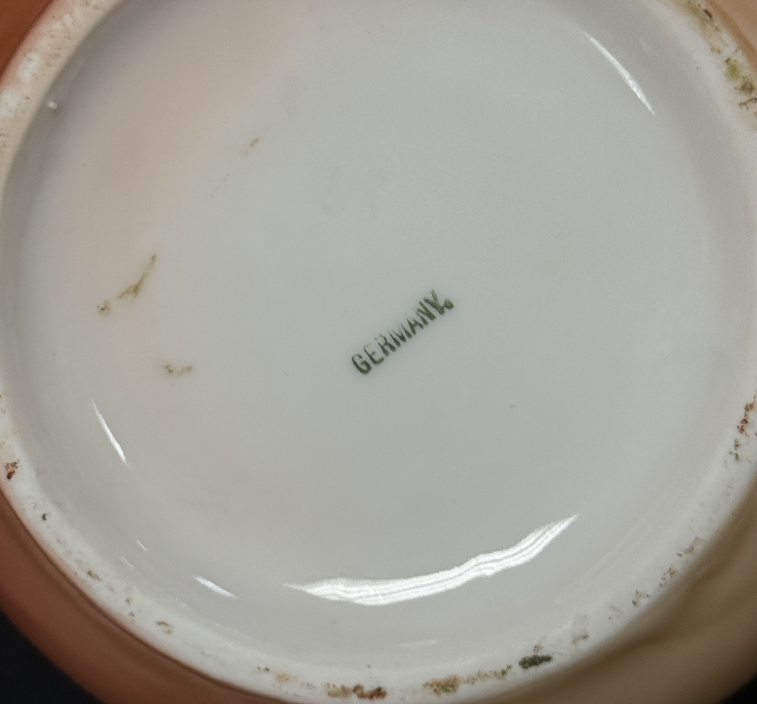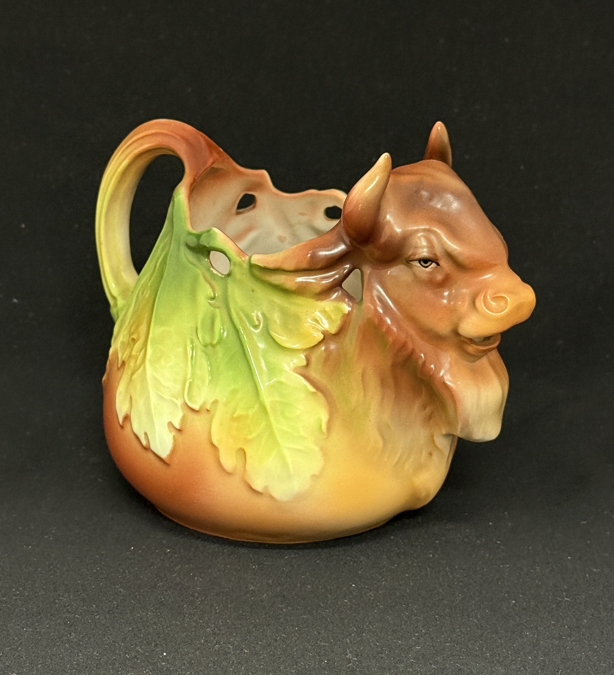 German porcelain figural pitcher of cow; ht. 4 1/2″. CONDITION: no chips, cracks, repairs, or material defects found, Jaremos attempts to call any material flaw that affects the price, but minor scratches and color variances are inherent to glass and antiques.