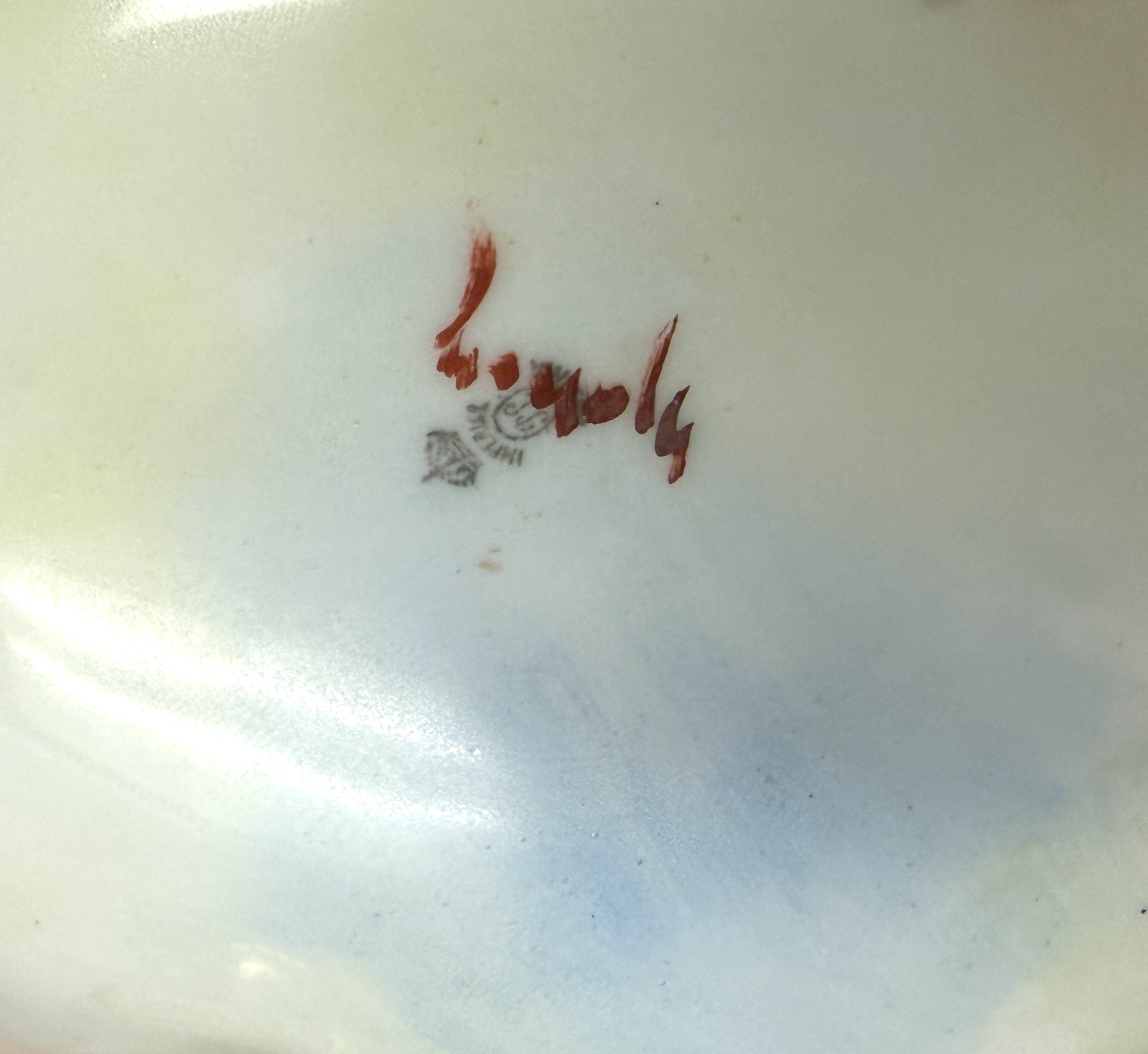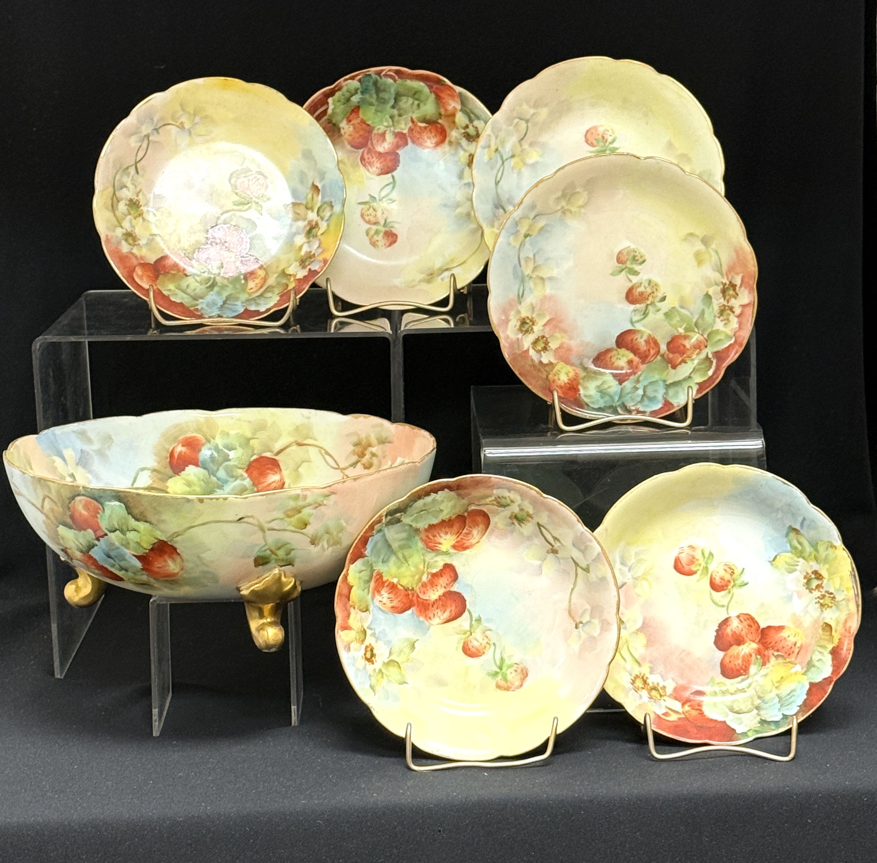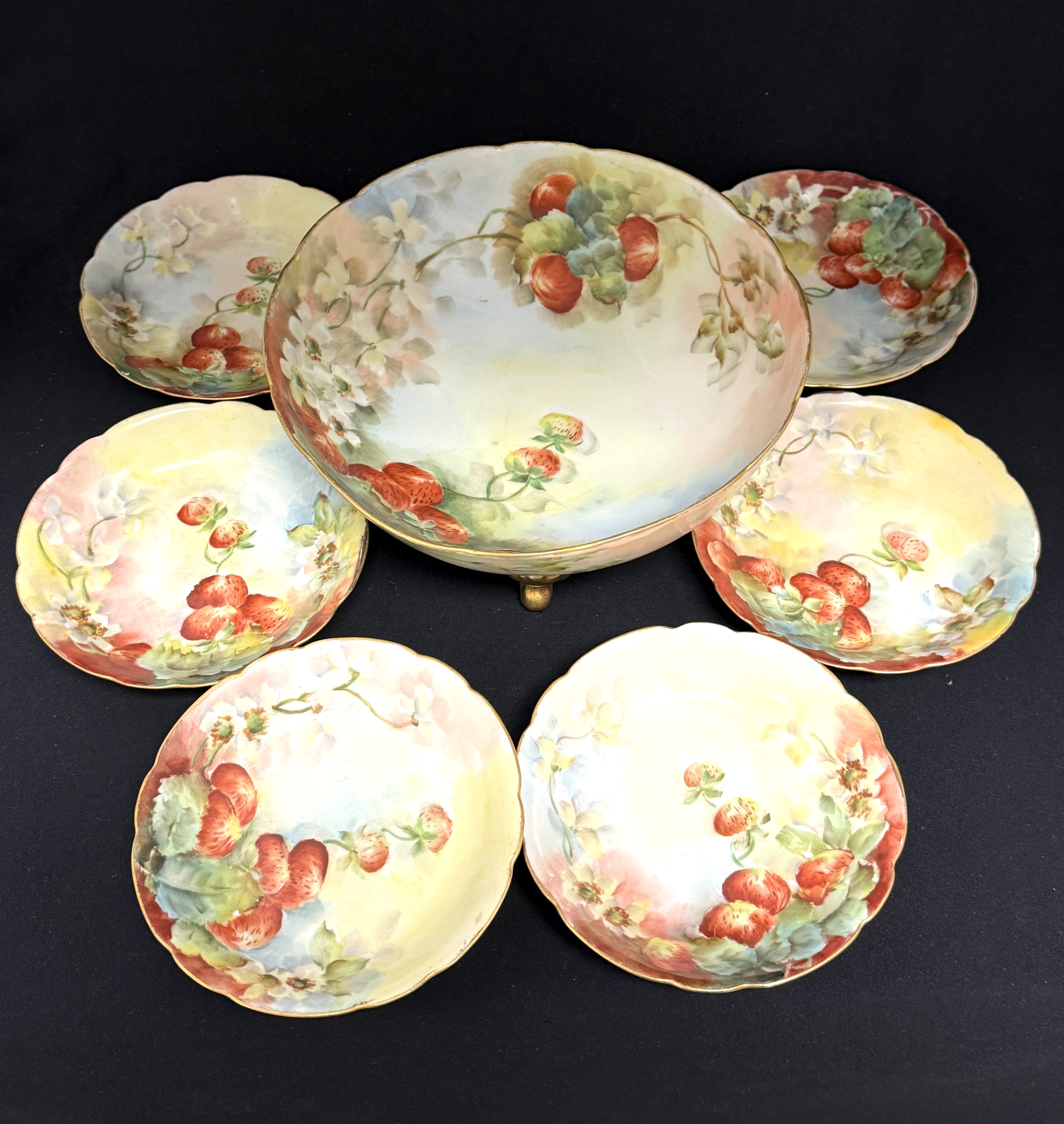 Limoges hand painted berry bowl set, footed serving bowl and 6 small bowls; diameter of largest 9 1/4″. CONDITION: no chips, cracks, repairs, or material defects found, Jaremos attempts to call any material flaw that affects the price, but minor scratches and color variances are inherent to glass and antiques.
