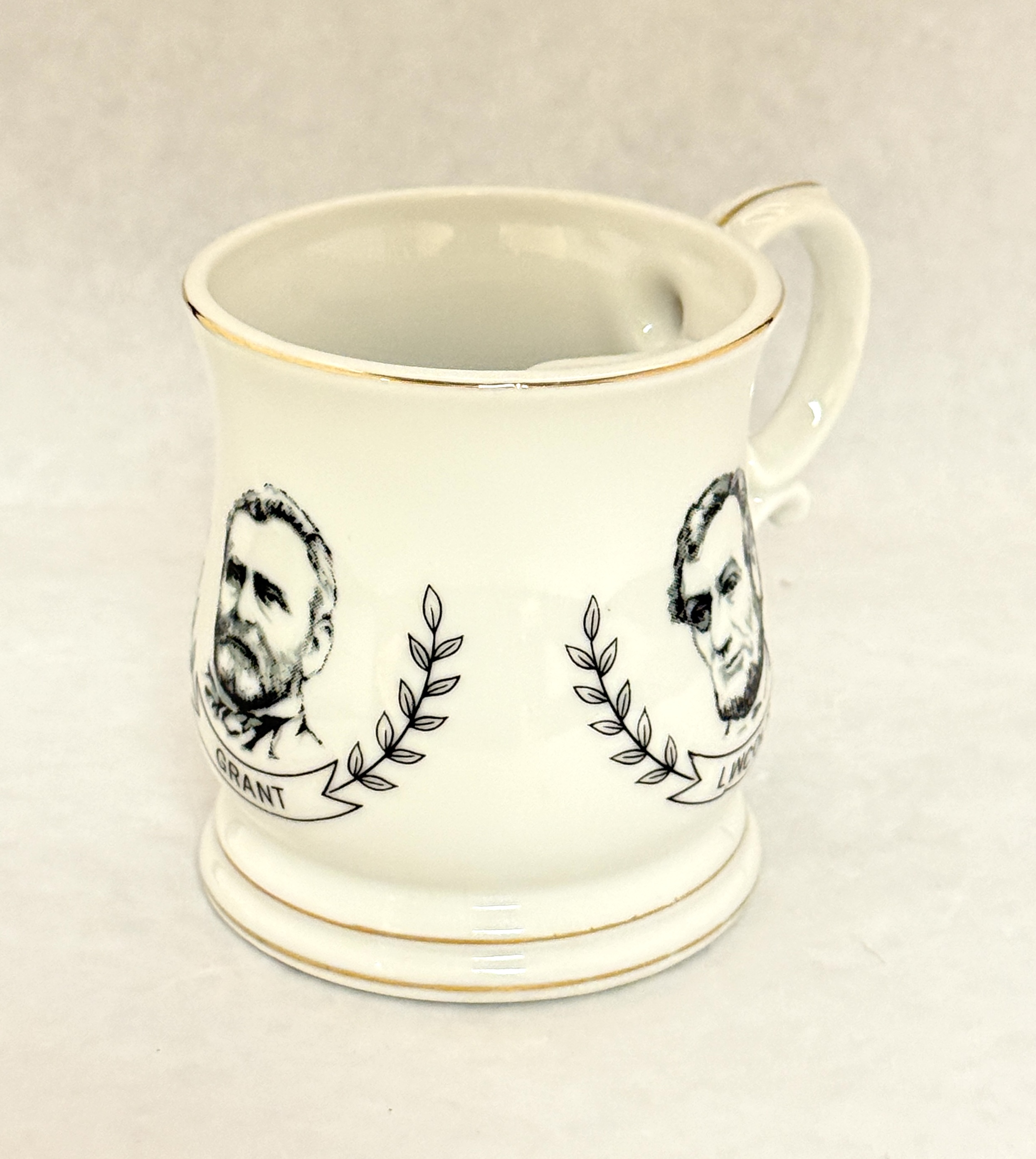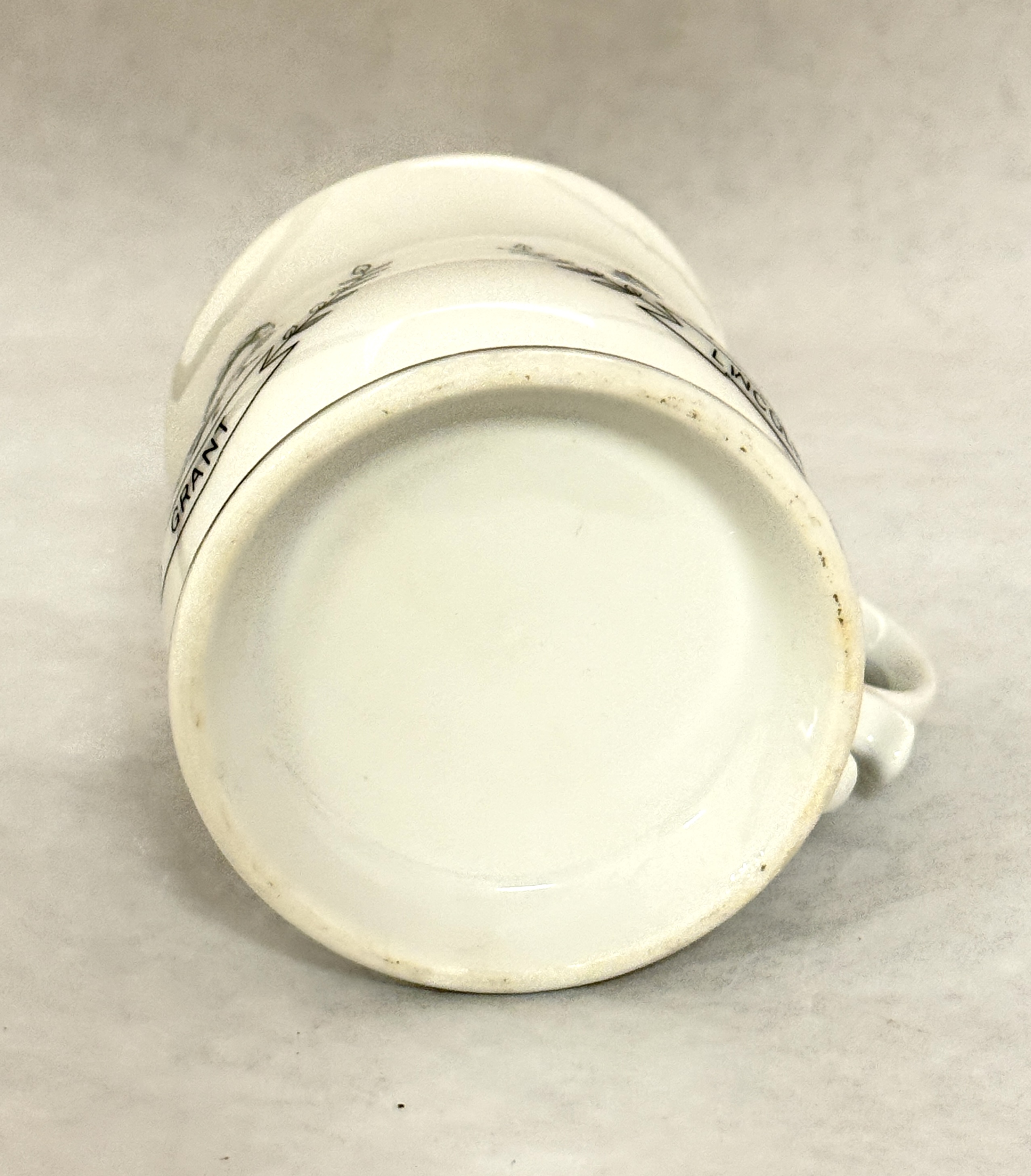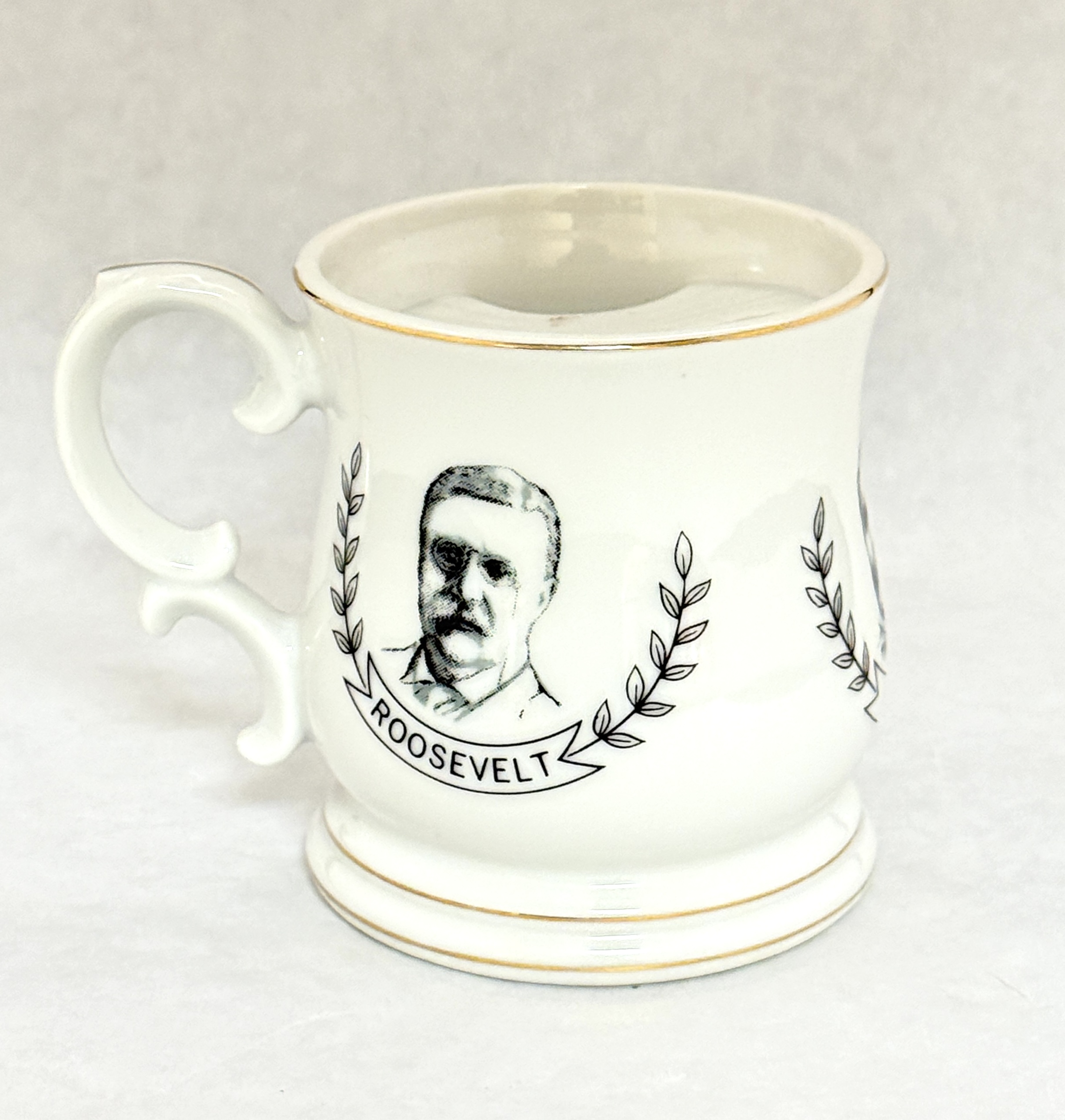 Porcelain patriot mustache mug with Roosevelt, Grant, and Lincoln portraits; ht. 3 3/4″. CONDITION: no chips, cracks, repairs, or material defects found, Jaremos attempts to call any material flaw that affects the price, but minor scratches and color variances are inherent to glass and antiques.