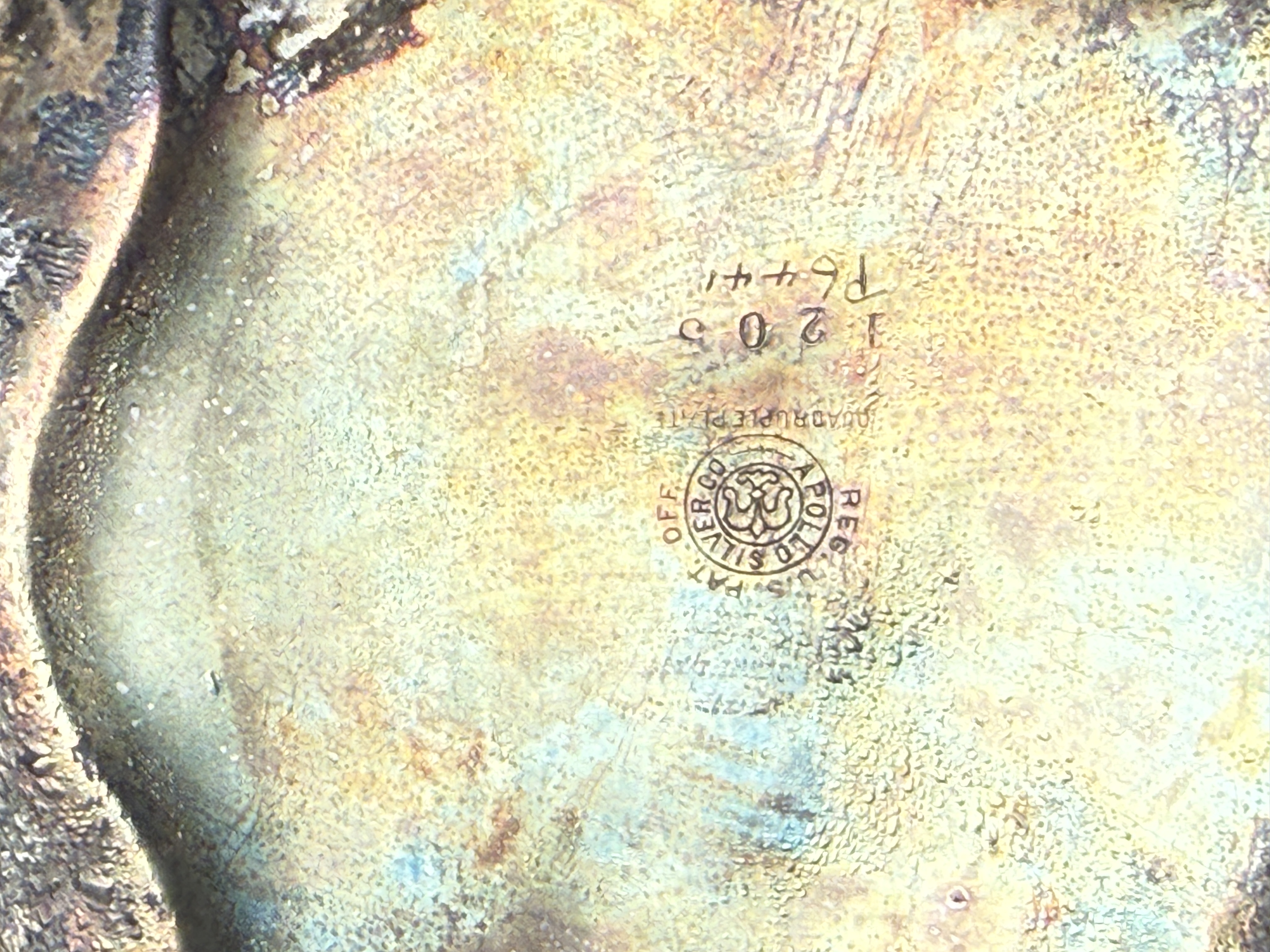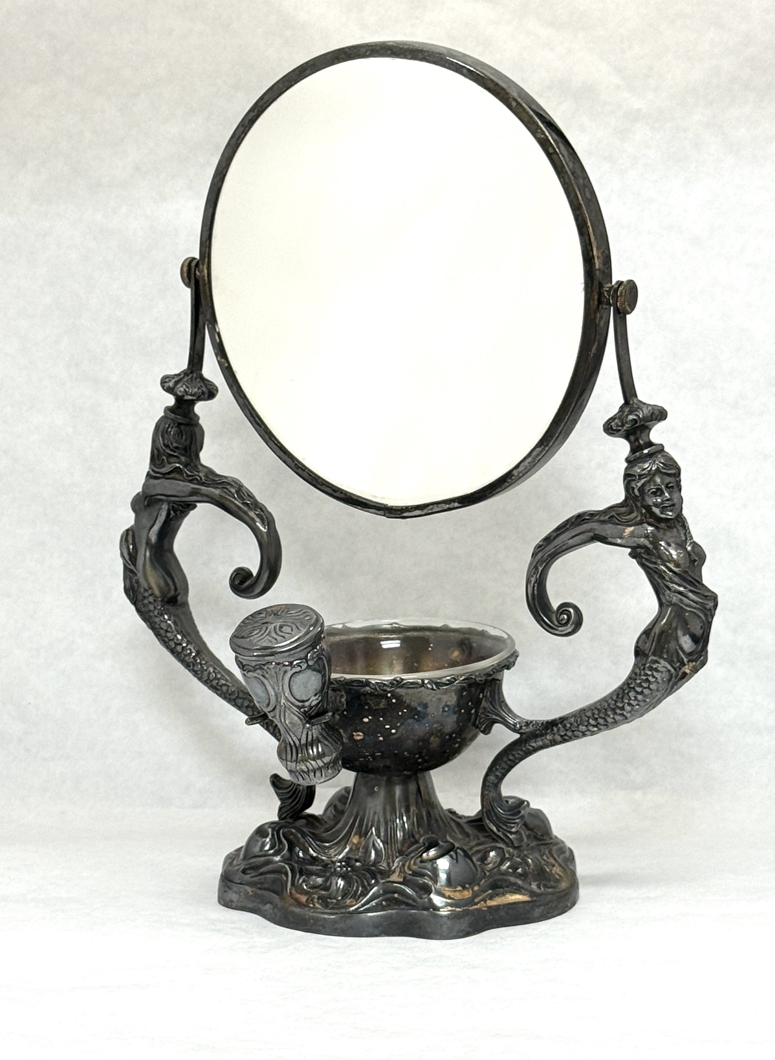 Aurora shaving mirror with brush holder and cream bowl; ht. 13″. CONDITION: no chips, cracks, repairs, or material defects found, Jaremos attempts to call any material flaw that affects the price, but minor scratches and color variances are inherent to glass and antiques.