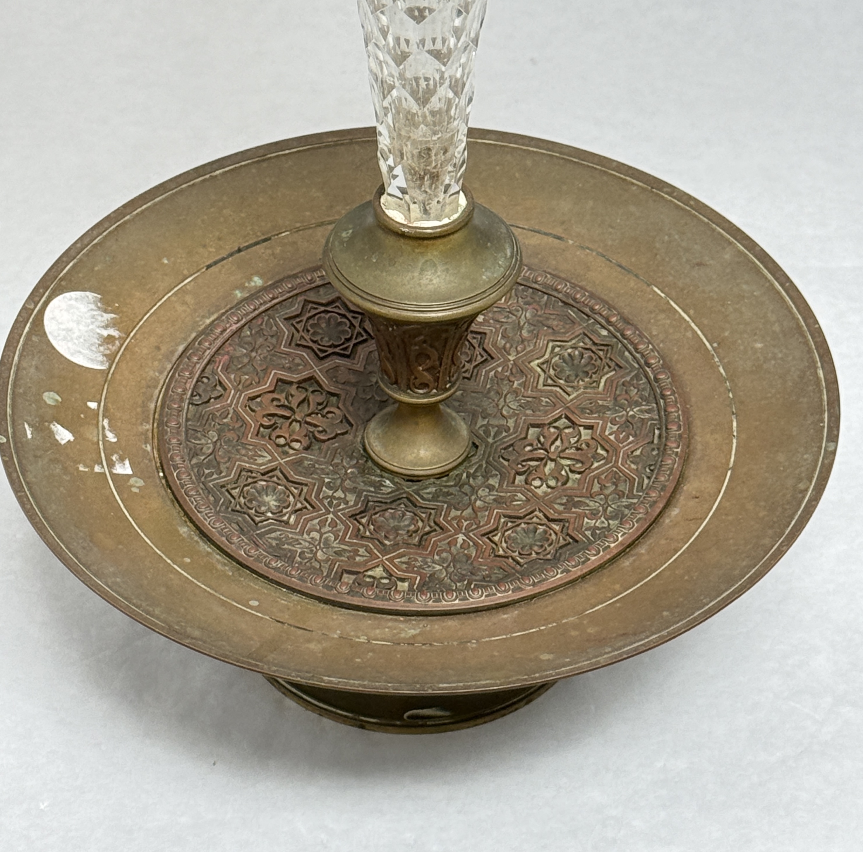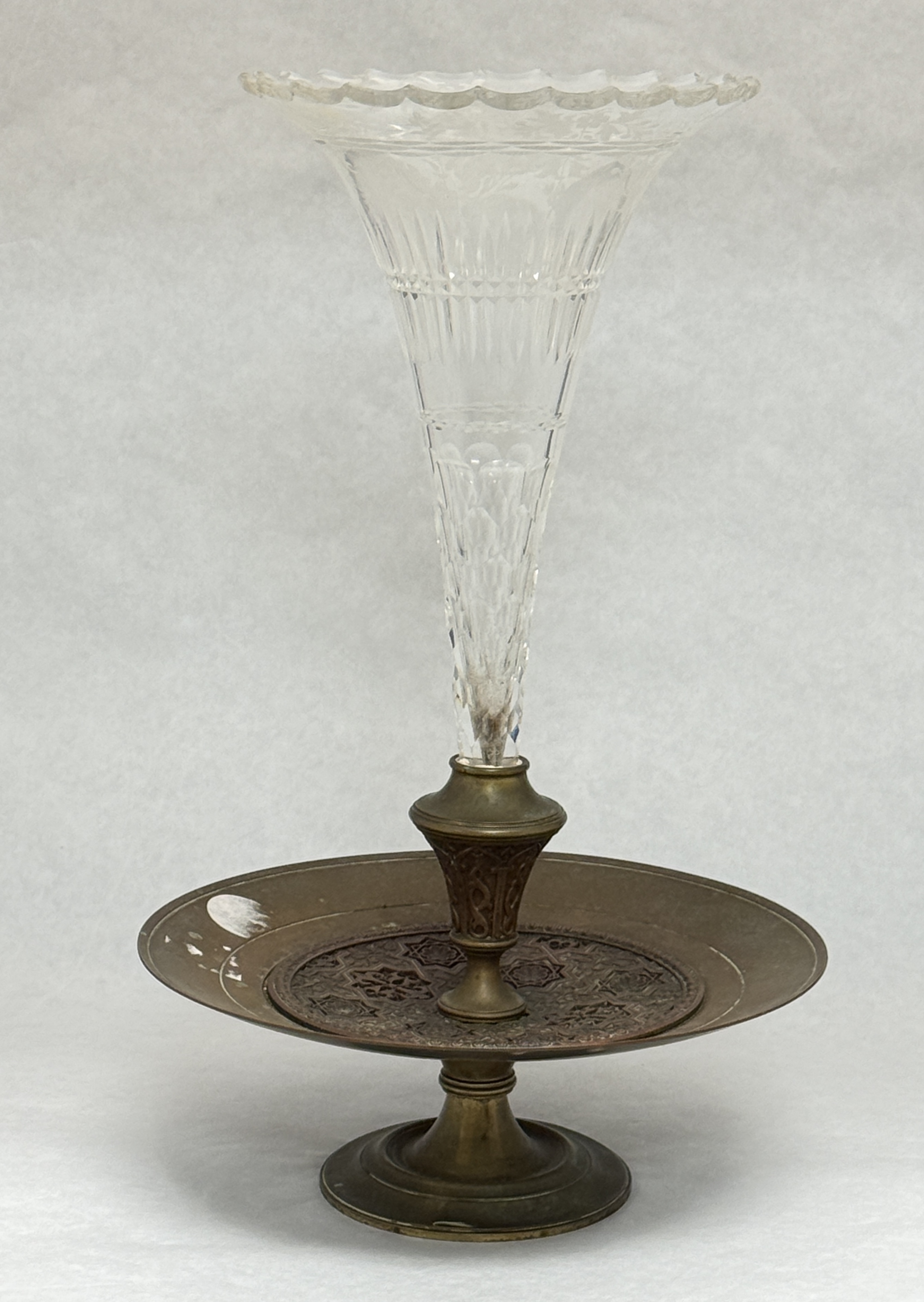 Metal and glass epergne; ht. 13 1/2″. CONDITION: no chips, cracks, repairs, or material defects found, Jaremos attempts to call any material flaw that affects the price, but minor scratches and color variances are inherent to glass and antiques.